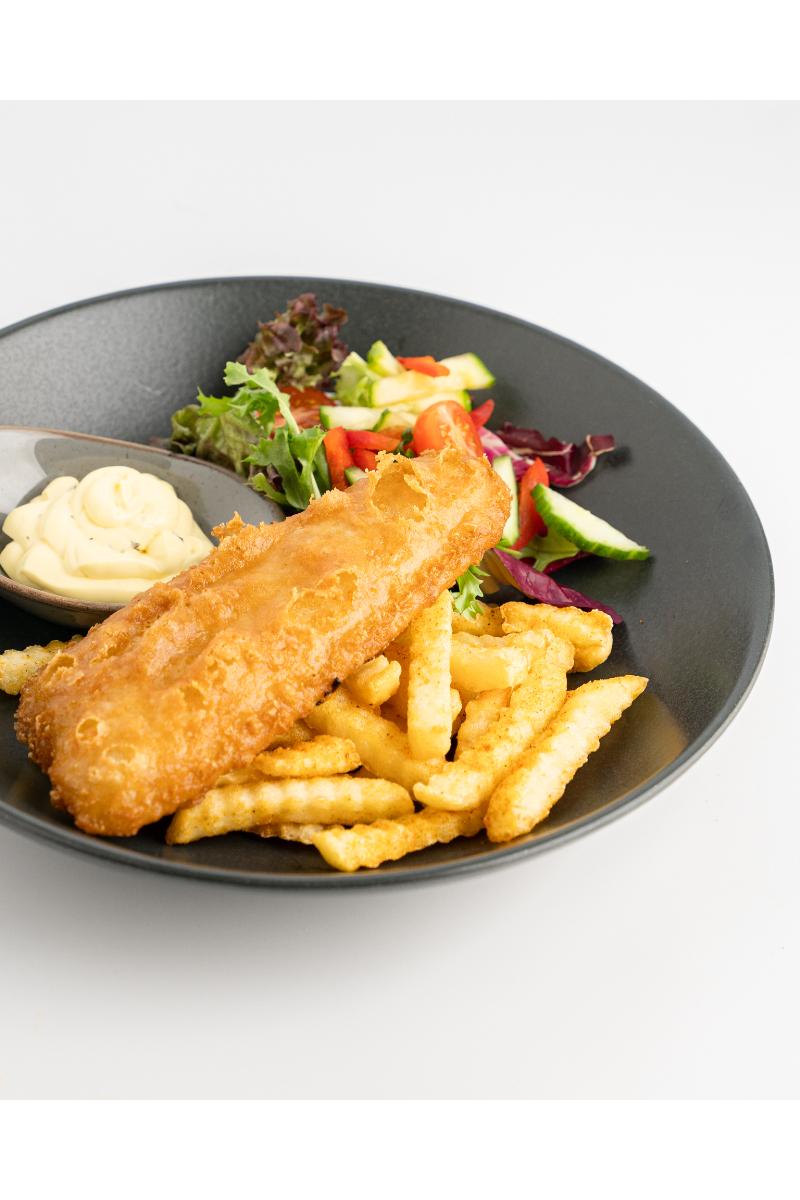 Panert torsk med pommesfrites og remulade. Allergen:Hvetegluten,fisk,melk,sennep,egg