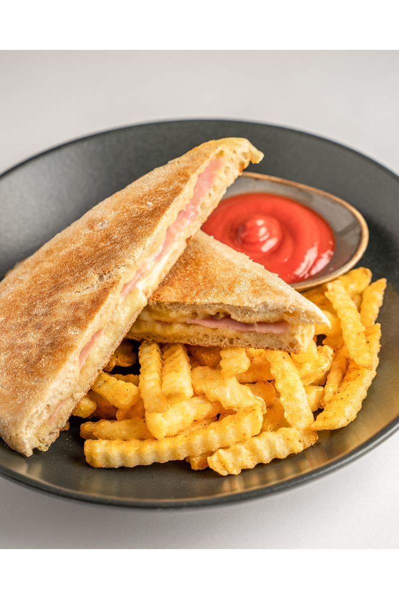 Toast på chiabatta med ost og skinke,serverast med pommesfrites.